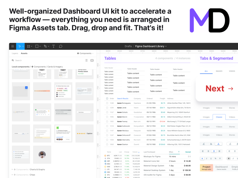 - Well-organized Dashboard UI kit to accelerate a workflow - everything you need is arranged in Figma Assets tab. Drag, drop and fit. That's it!