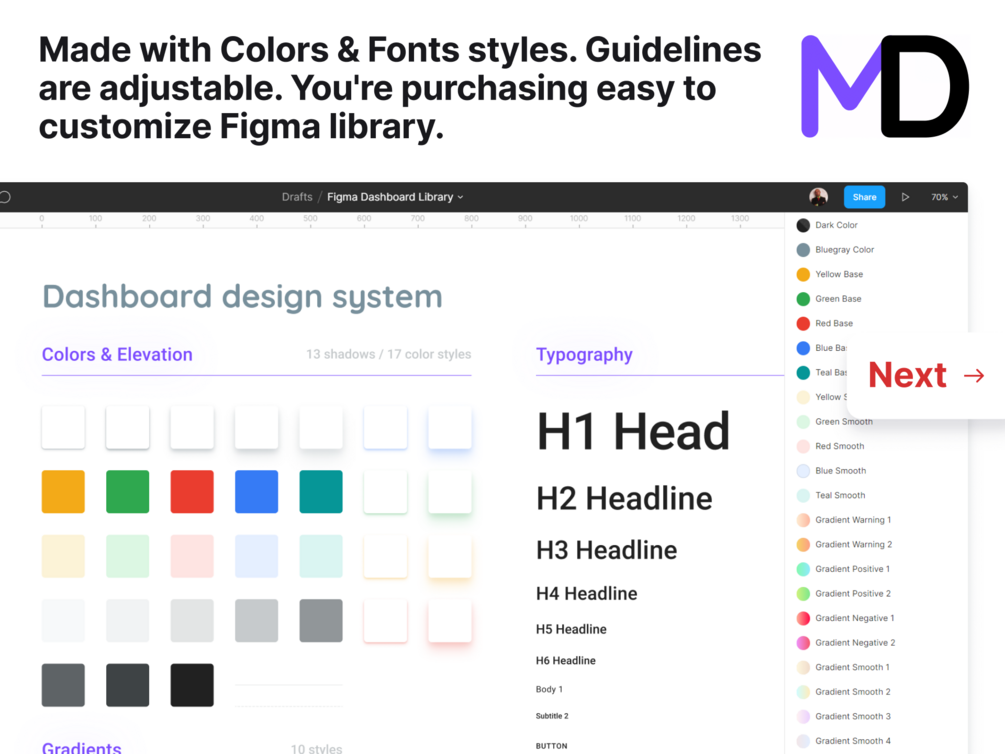 - Made with Colors & Fonts styles. Guidelines are adjustable. You're purchasing easy-to-customize Figma library.