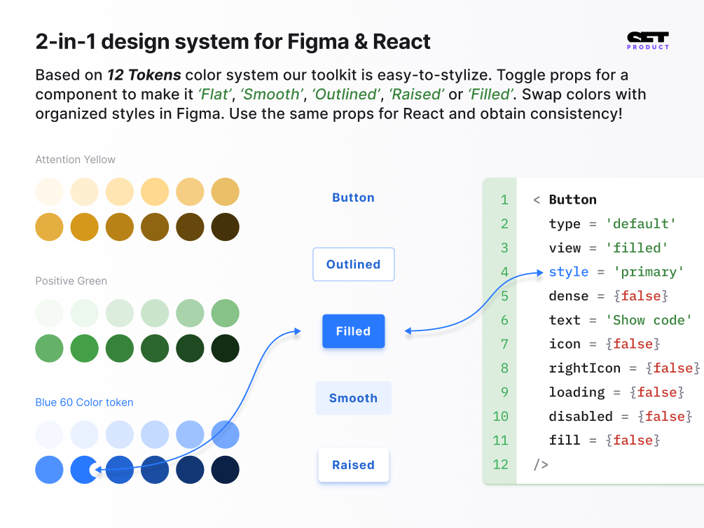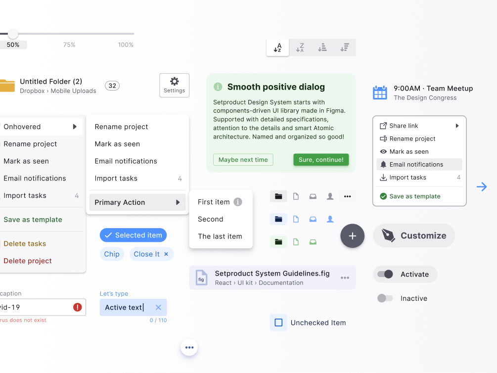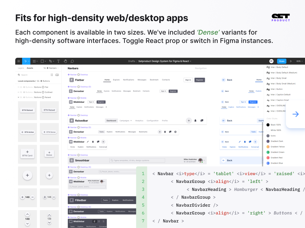 Setproduct Design System is a based UI toolkit for the web. Designed and well-organized in Figma. Optimized for building complex data-dense interfaces for desktop and mobile applications. This digital product contains both Figma design files (FIG) and React components (ZIP) which styled and named analogously.