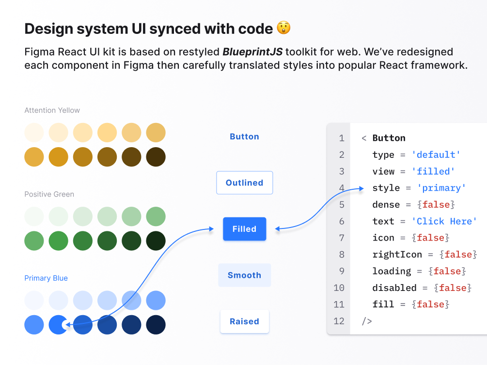 Figma React UI kit — designed in Figma and coded for React to build web apps faster. Based on restyled Blueprint.js / Chakra-UI. Powered by Figma's auto-layout. Allows toggling between styles quickly with Variants: Flat, Filled, Raised, Outlined and Smooth (Shaded). Themed into ⚪🔵🟢🔴 to swap components themes with ease.