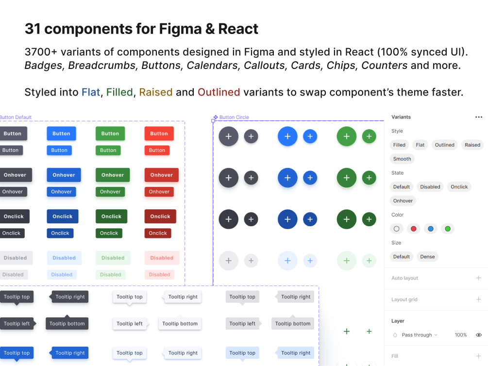 Figma React UI kit — designed in Figma and coded for React to build web apps faster. Based on restyled Blueprint.js / Chakra-UI. Powered by Figma's auto-layout. Allows toggling between styles quickly with Variants: Flat, Filled, Raised, Outlined and Smooth (Shaded). Themed into ⚪🔵🟢🔴 to swap components themes with ease.