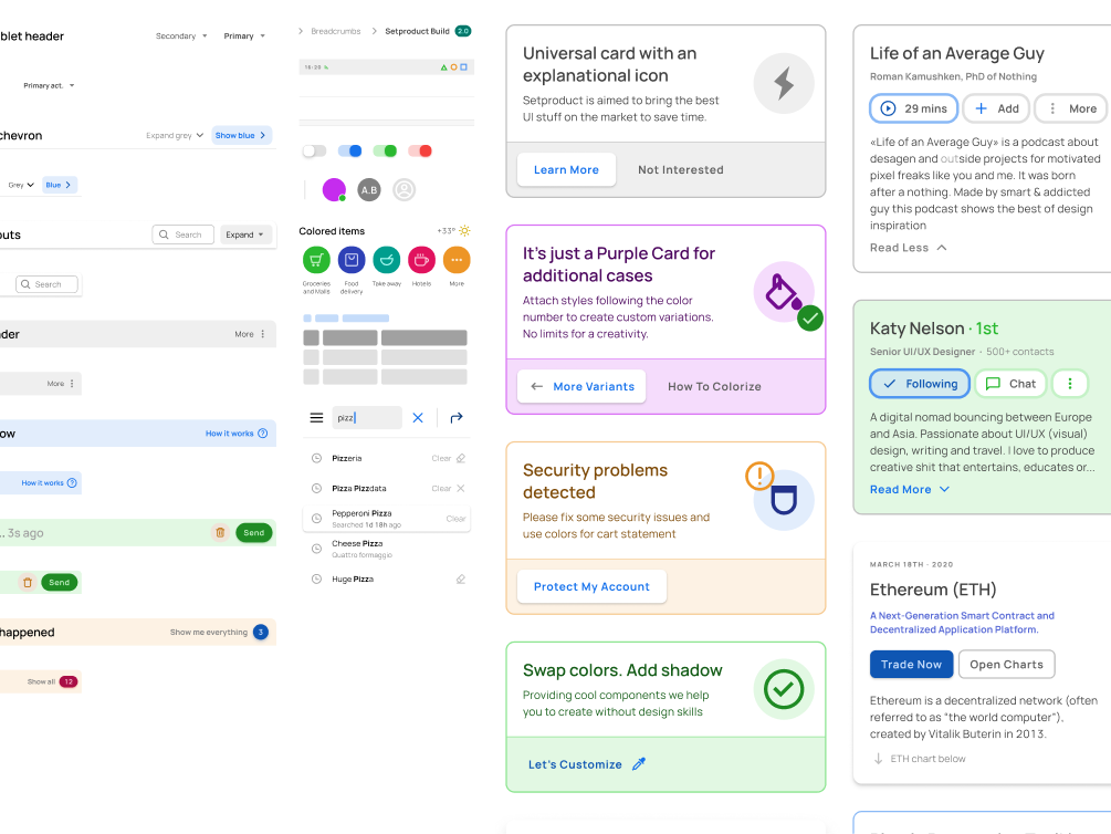 Stop creating from scratch the same buttons, lists, and other UI items along with every new project started. Use our library to have on hand everything you need to design better and faster.