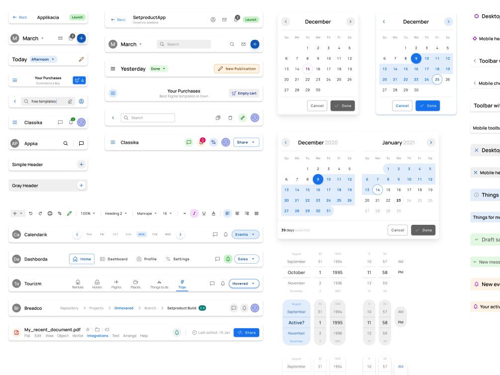 1100+ components & 40 app templates beyond Material Design. Powered by top-notch shapes and Manrope font. Customizable & Adjustable UI kit. Easy to change fonts and swap colors. Modify and reuse the templates to save time and human resources. Suit your mobile or desktop app with detailed patterns and styled-components from the nearest future.