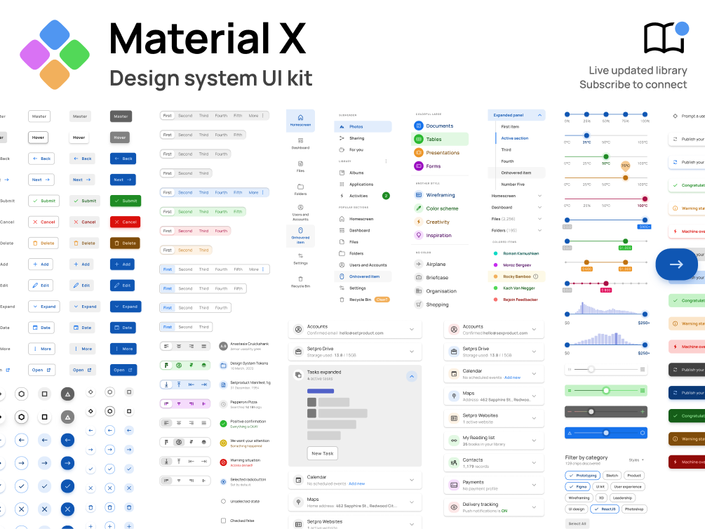 Available as Figma team library — You'll get an invitation to a Material–X project in Figma within 24h after the purchase. Stay up-to-date with access to a team project where we ship in real-time. Your subscription includes updates and unlocks the components & templates via Figma's panel.