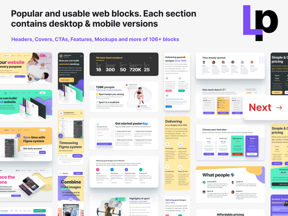 Categories: Headers, Covers, Hero Images, Features, Mockups, Isometric Previews, Features, Subscription Forms, FAQ, Testimonials, Pricing Plans, Application Blocks, Promotion Blocks, Image Grids, Cards, Footers.
